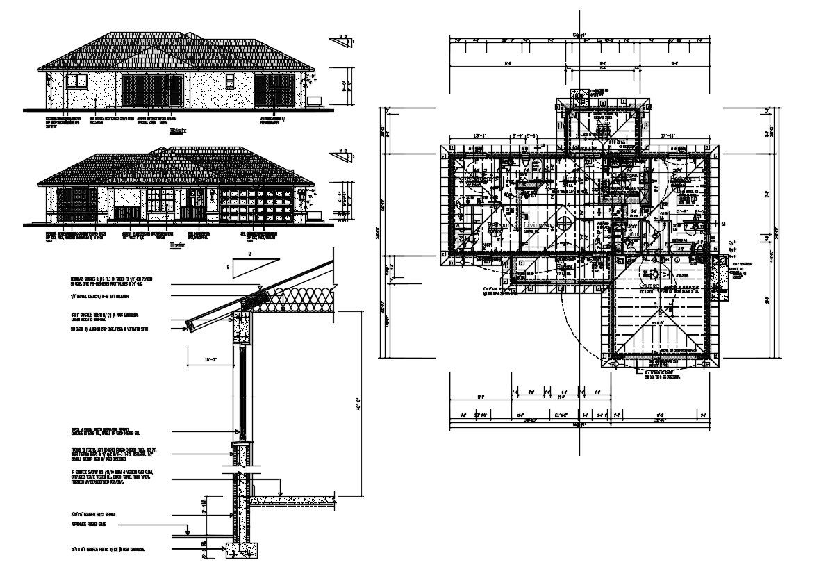 3 BHK Working House Plan DWG File; the residence house ground floor plan, roof plan with wall support section, and elevatio9n design. download 3 BHK house plan AutoCAD file and learn this CAD drawing plan.