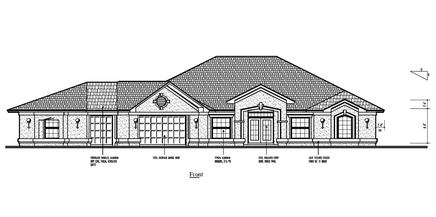 Attic House Front Elevation Design DWG File; download free AutoCAD file of attic truss house front elevation design with dimension detail.
