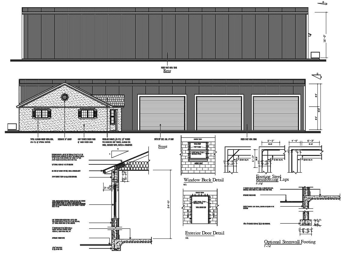 Godown Elevation Design DWG File; 2d CAD drawing of godown project stem wall footing, steel reinforcement laps, roof support wall section, and elevation design in AutoCAD format.