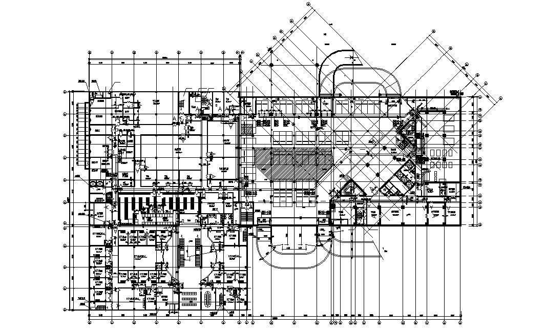 CAD drawing details of commercial building design that shows building working plan, dimension set, floor level, section line, room dimension, and various other work details download plan for detailed design.