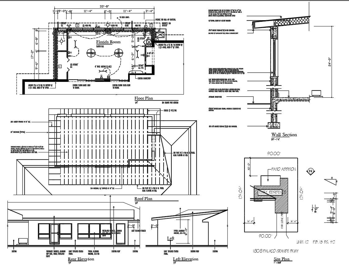 Florida Room CAD Drawing; download free DWG file of floor plan, wall section, site plan, roof plan, and elevation design of Florida Room plan.