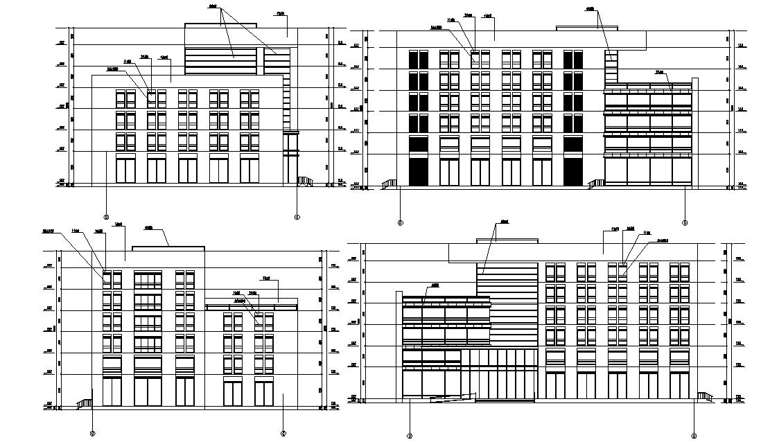 Contemporary Commercial Building Elevations AutoCAD File; elevation of a commercial building with level dimension, texting detail CAD file.