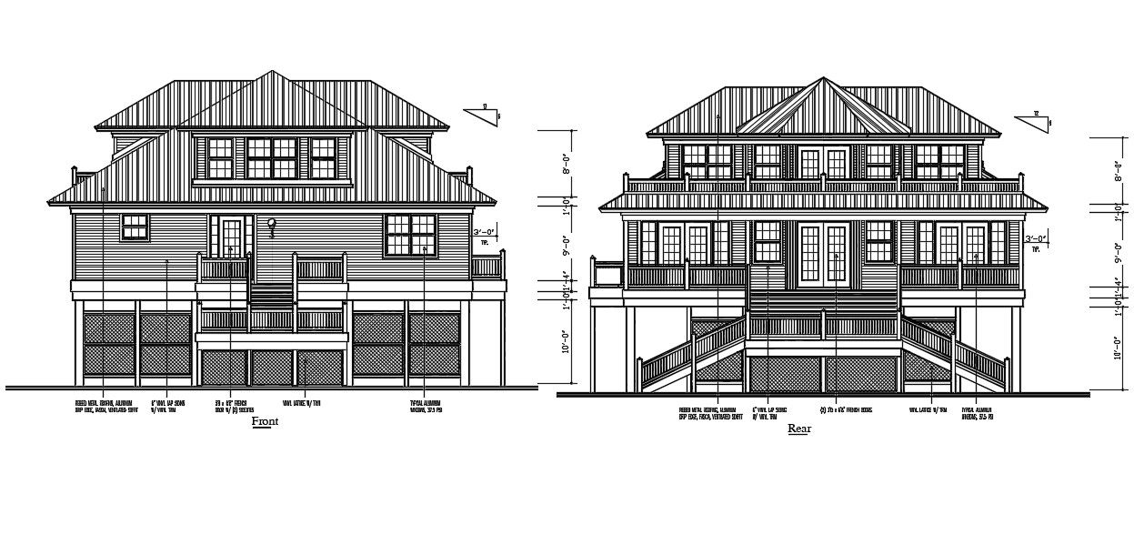 Attic House Elevation Design DWG File; The traditional attic house front elevation and rear elevation design with dimension details. download DWG file of attic house design with dimension details.