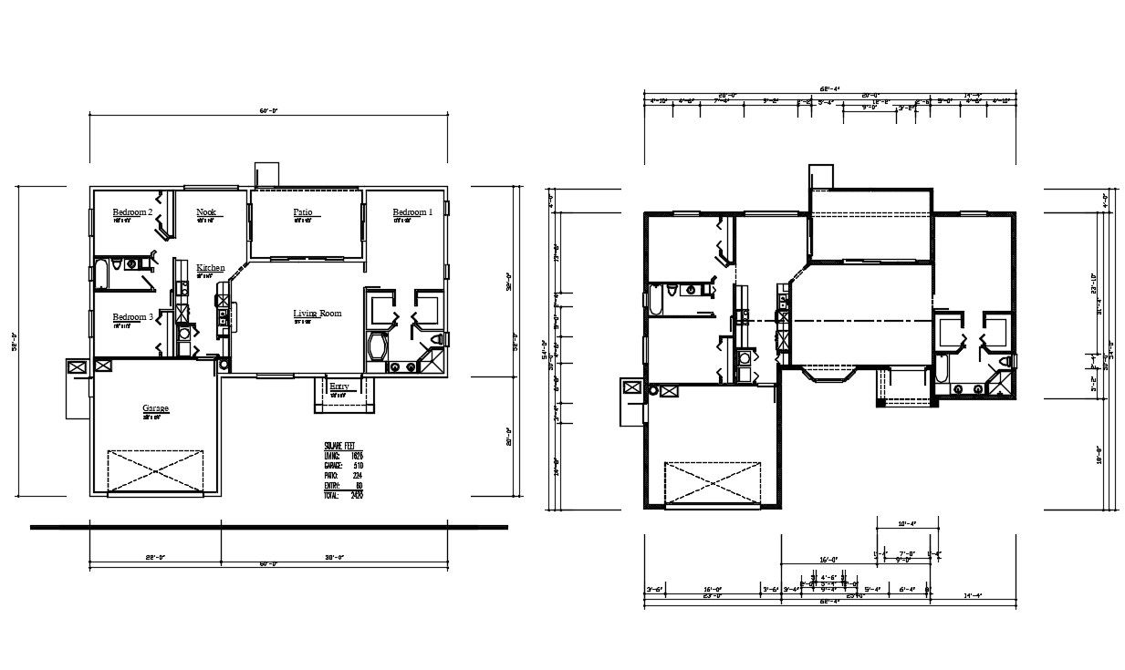 3 BHK House Floor Plan DWG File; download AutoCAD file of residence house floor layout plan CAD drawing includes 3 bedrooms, kitchen, dining area, living room, and garage with total building area 2420 SQFT.