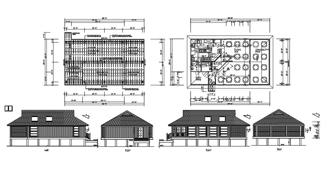 Restaurant Project AutoCAD Plan; 2d CAD drawing of restaurant floor plan, roof plan, and elevation design CAD drawing with dimension and description details.
