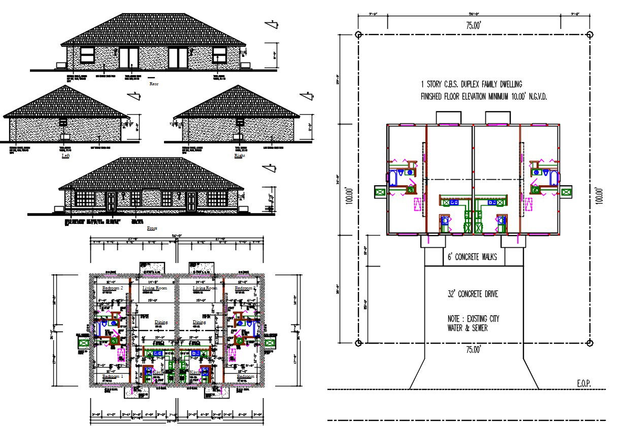 Twin House Project AutoCAD File; the architecture twin house project CAD drawing shows 2 BHK floor layout plan, plot area and elevation design with all dimensions and description details.