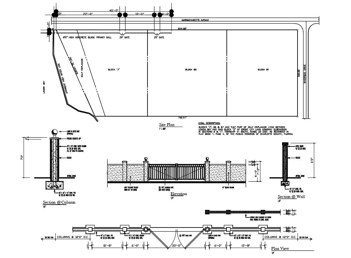 Compound Wall And Gate Design DWG File; download free AutoCAD file of site area plan with compound wall and get elevation design and top view plan.
