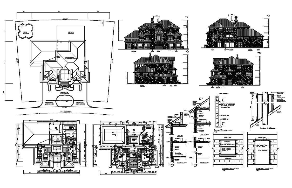 Architecture Attic House Plan DWG File; 2d CAD drawing of residence house ground floor plan first-floor plan with site area plan, wall section and elevation design in AutoCAD format.