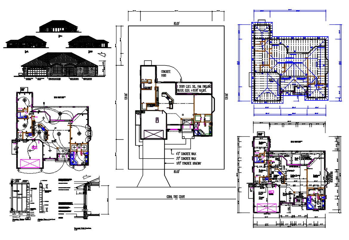 2 Bedroom House Project DWG File; the architecture 2 BHK house project CAD drawing shows ground floor layout plan, electrical wiring plan, roof plan, wall section and elevation design with dimension detail and description for easily readable this AutoCAD drawing.