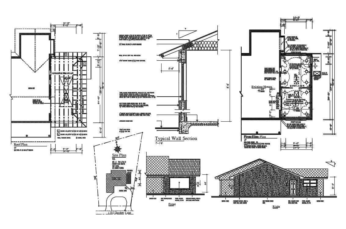 Typical Working House Plan DWG File; 2d CAD drawing of exterior house plan CAD drawing shows exiting building with purpose floor plan, electrical plan, wall section, roof plan, site plan and elevation design in AutoCAD format.