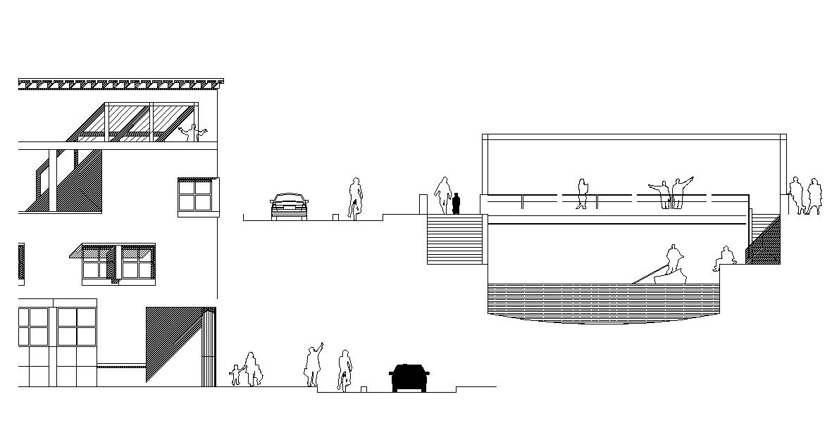 Building Elevation With Road Side View AutoCAD File Free; elevation of city view with a roadside view and building elevation CAD file free.