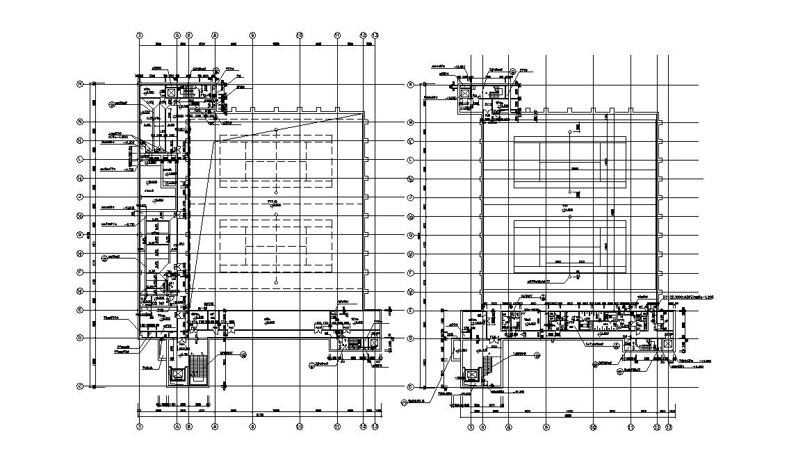 Design plan of commercial hub building that shows building dimension working set, centerline, floor level, and various other blocks detailing download file.