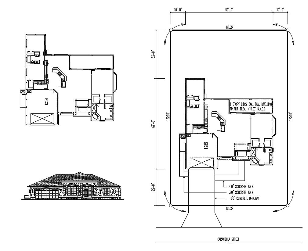 Simple House Plans DWG File; the residence house ground floor plan, plot area with measurement and front elevation design.