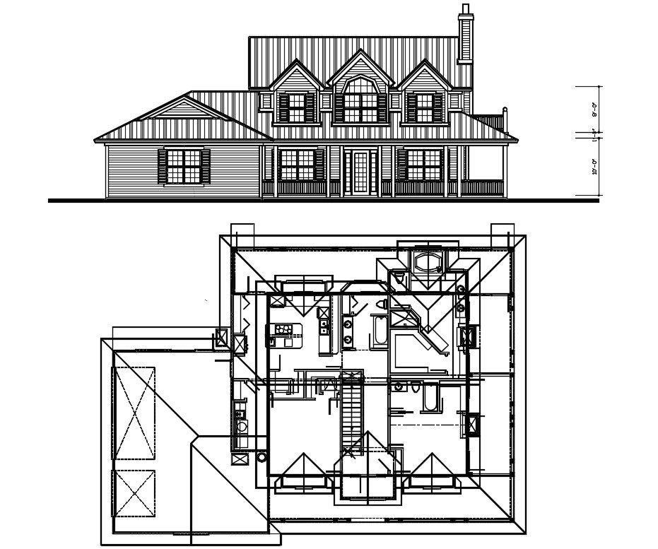 2 Storey House Project DWG File; the residence house roof section floor plan and front elevation design with dimension detail in AutoCAD format.