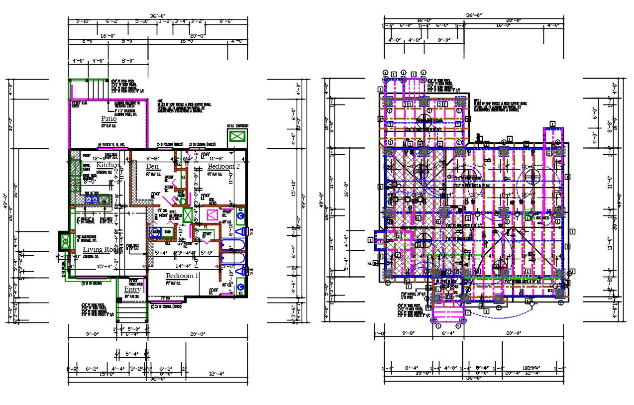 36 FT x 30 FT House Layout Plan; the architecture house layout plan includes 2 bedrooms, kitchen, living room, and patio area with dimension detail. download AutoCAD file of the house project and get more detail about the electrical layout and floor plan.