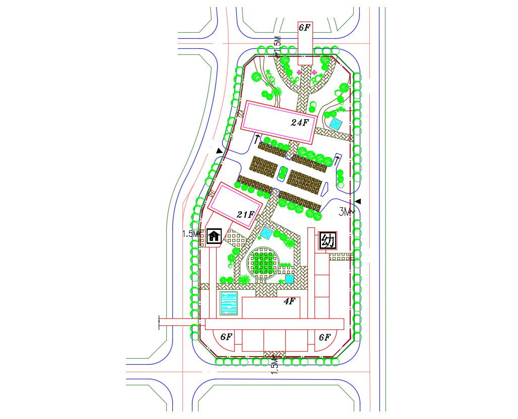 AutoCAD drawing details of commercial building area design that shows existing building details, road networks, parking space area, area landscaping details, and various other units details download the file.