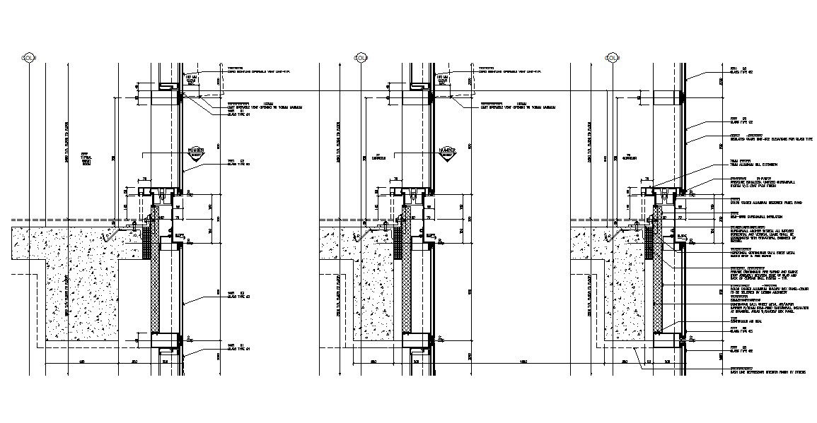 Curtain Wall Section CAD Drawing; curtain wall anchor system all imposed horizontal and vertical loads shall be coordinated with the structural engineer of record. provide continuous fire safety and smoke stop assembly between edge of the slab and back of the curtain wall system.