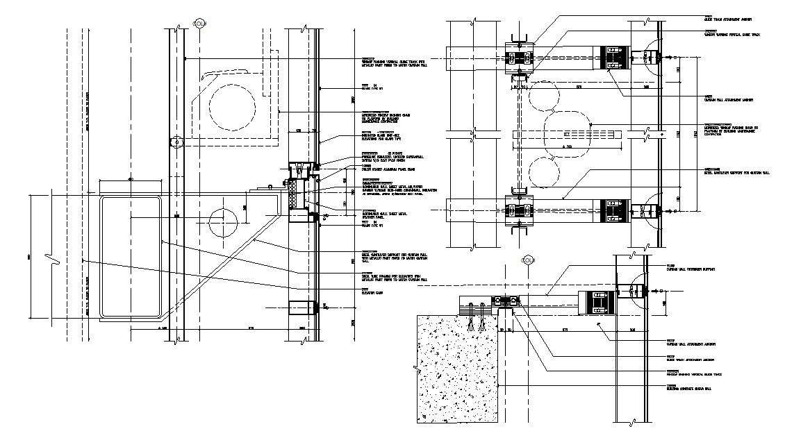 Curtain wall Fixing CAD Drawing; download free AutoCAD file of curtain wall fixing detail with slab and back of curtain wall system.