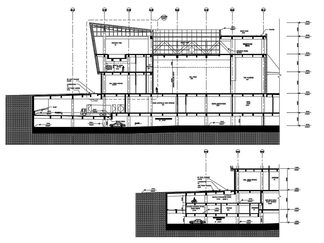 Section Drawing Of Modern Commercial Building AutoCAD File; this is the two section of a commercial building includes structure detail, texting detail, and floor level detail in DWG Format.