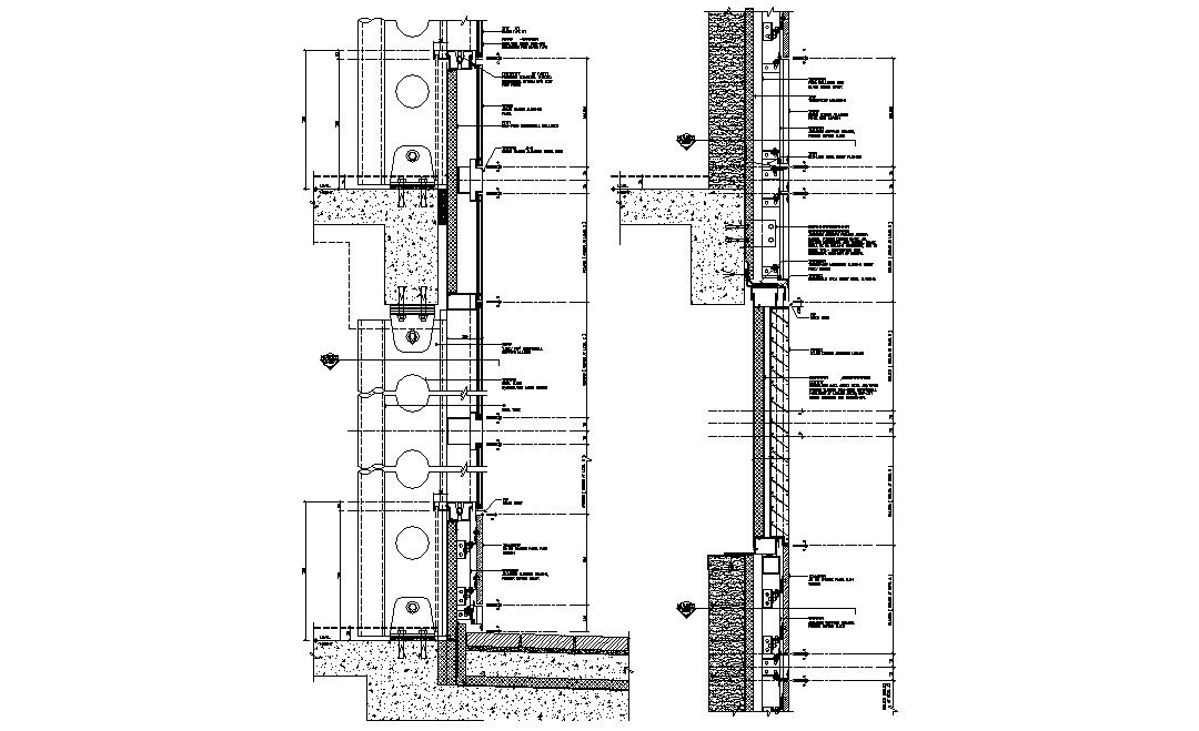 Curtain Wall Construction AutoCAD Drawing; the concrete and glass curtain walls showing construction detail CAD drawings that make fireproof buildings and increase energy savings.