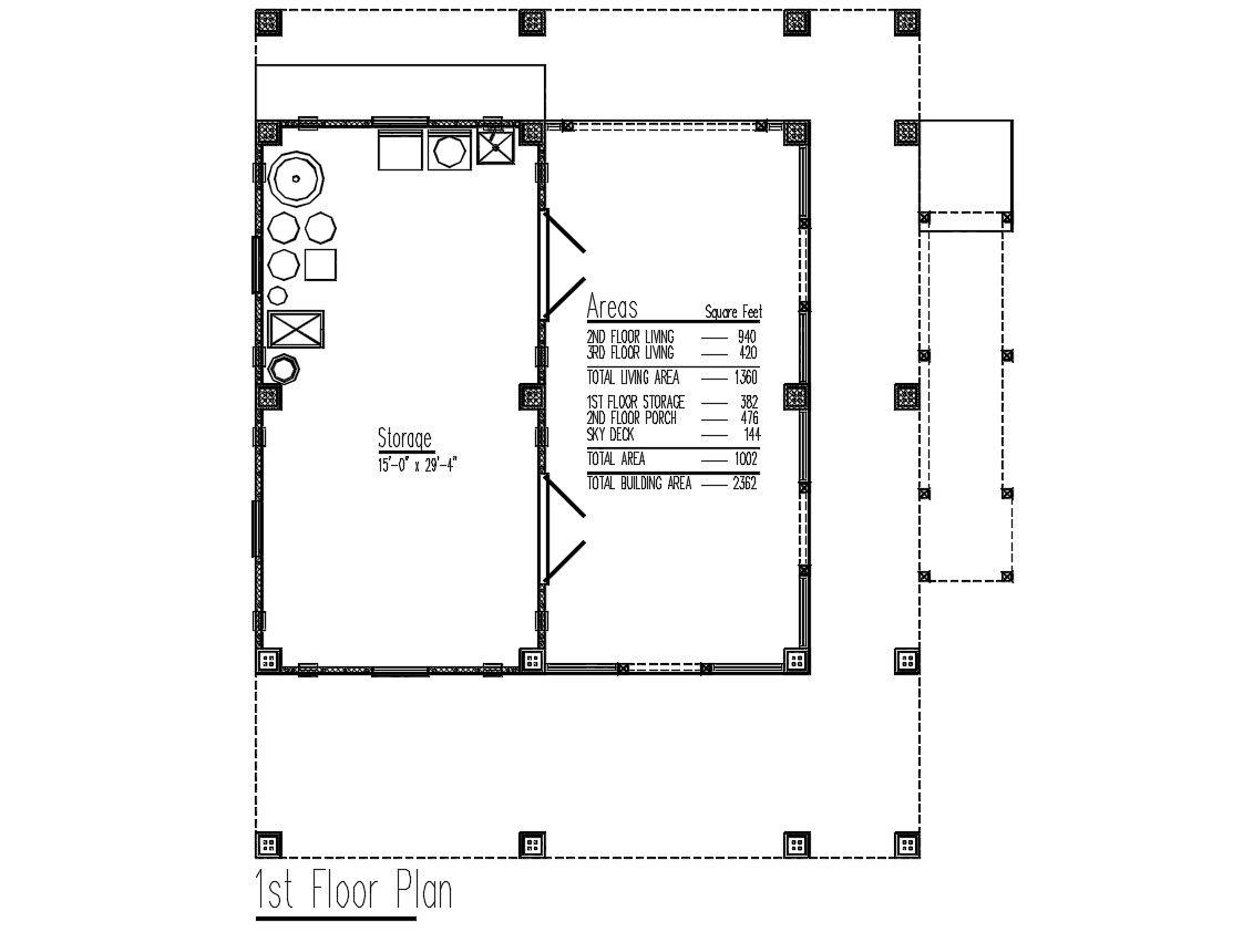 Download First Floor Plan AutoCAD File Free; this is the first-floor plan of residential area includes area table, column plan, and roof dotted line in DWG file free.