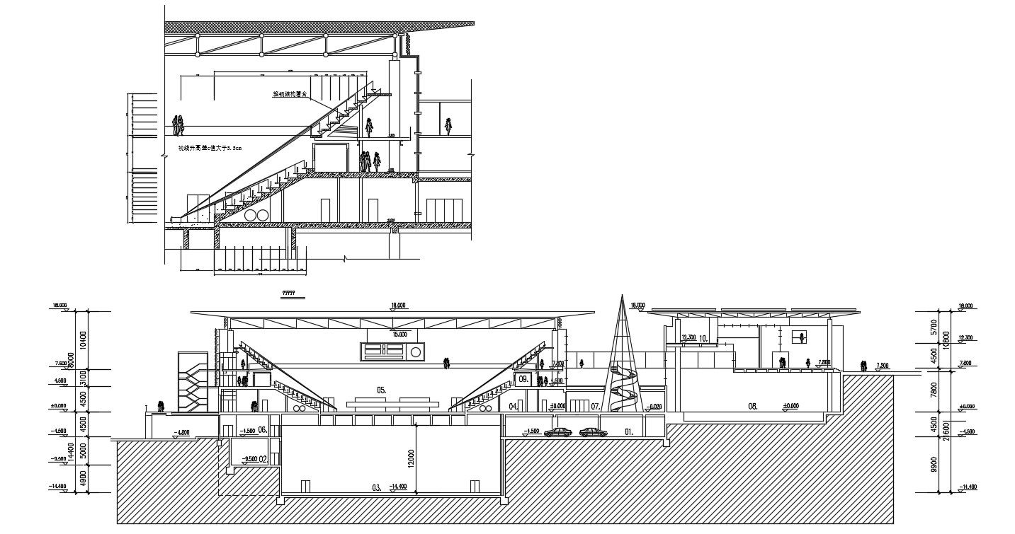 Auditorium Building Section CAD Drawing; the auditorium building cross-section CAD drawing includes seating arrangement and building structure detail in AutoCAD software file.
