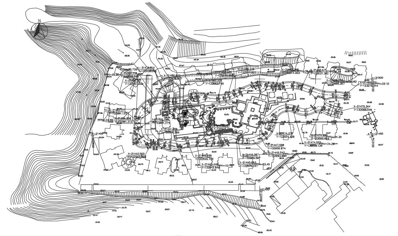 CAD drawing details of residence area contour planning design that shows contour lines details along with existing building units, road network, and other area detailing download file.