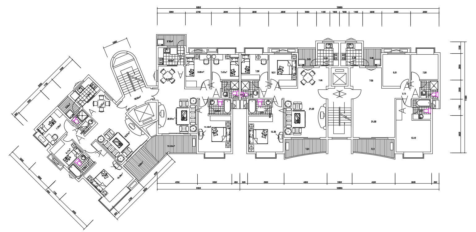 Residential 3 BHK apartment plan that shows furniture layout details in the apartment along with dimension working set, rooms, and various other units details download a CAD file.