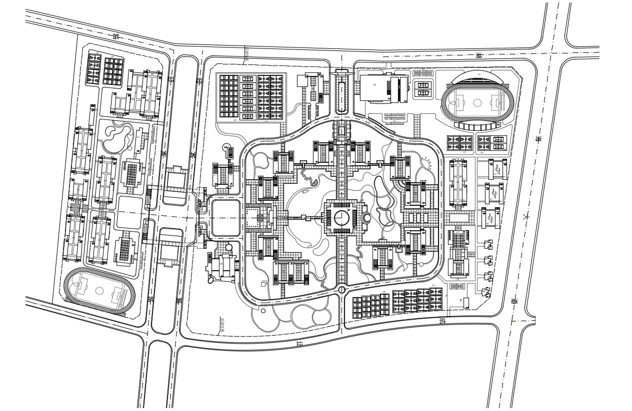 Commercial building area design plan that shows road network details in area, existing building units, sports ground, landscape, parking space area, and various other details download CAD drawing for free.