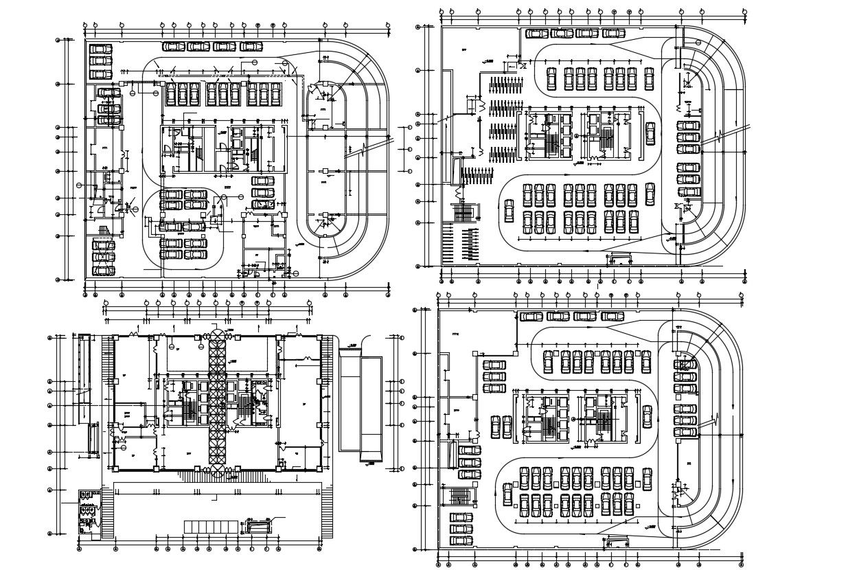 Car parking space area design plan that shows a 90-degree car parking system, ramp design, elevator, staircase, markings and signs, dimension set, and various other amenities details of parking lot download CAD file.