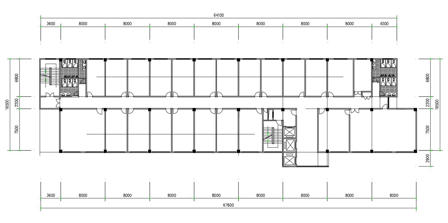 2d CAD drawing details of building column installation plan that shows column spacing, dimension working set, room design, sanitary public toilet design, and various other amenities details of building download file.