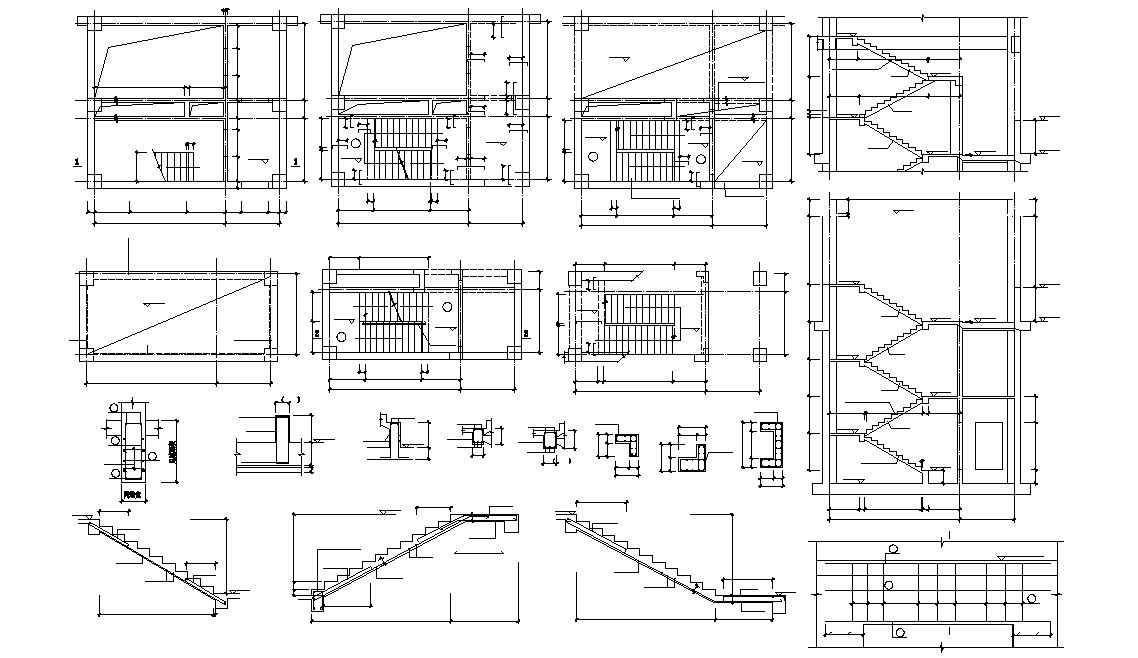 Structural plan and section details of the staircase that shows staircase riser and tread details along with dimension set, staircase reinforcement, and various other structural blocks details download a CAD file.