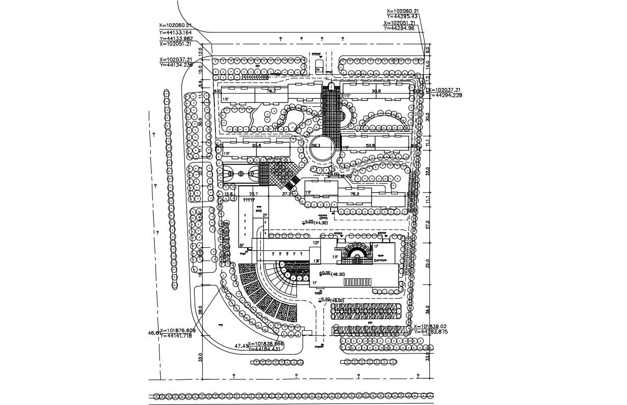 Commercial building area design plan that shows existing building details in the area along with nearby road networks, parking space area, landscape design, and various other detailing download CAD files for free.