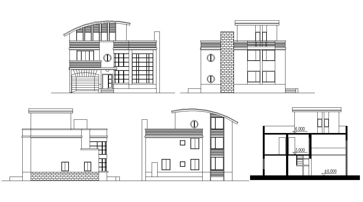 House Plan elevation layout plan; shows the details of the side elevation, top elevation, front elevation and back elevation of the house. Also given the section details.
