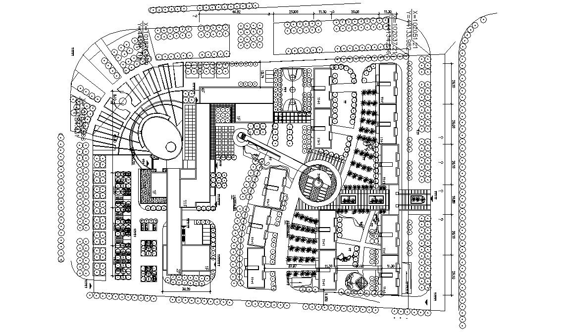 Club House Plan CAD Drawing; download free AutoCAD file of clubhouse top view plan shows landscaping design, exiting building, and sports ground.