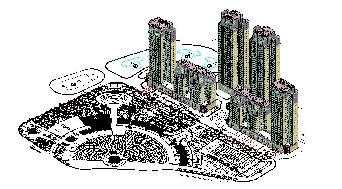 3D residential building plan; includes the details of the high rise building along with the plot area. Also seen the isometric view of the building.