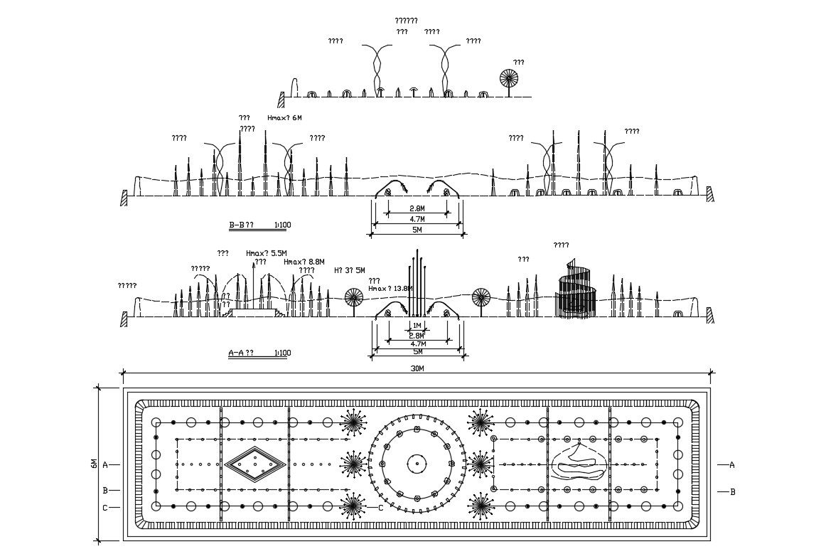 Garden Landscaping Design Free DWG File; download free AutoCAD file of garden landscaping design CAD drawing shows fountain, tree, and plant elevation design.