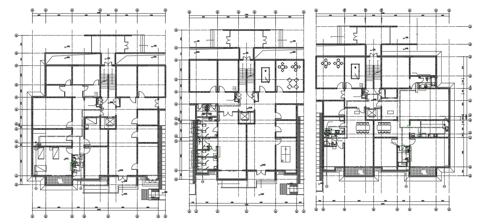 CAD drawing details of commercial building design plan along with apartment plan that shows building dimension working set, centerline, staircase, building floor level, and various other building amenities details download file for detailed presented work drawing plan.