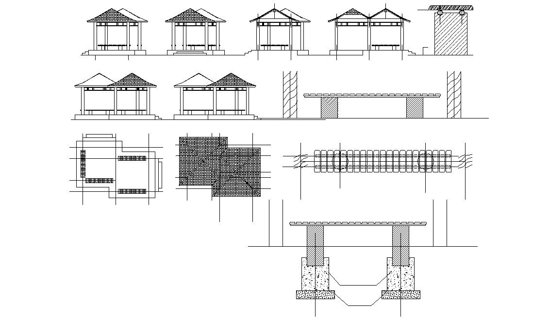 Gazebo shade elevation design that shows gazebo roof plan detail and gazebo different sides of elevation, download CAD file for free.