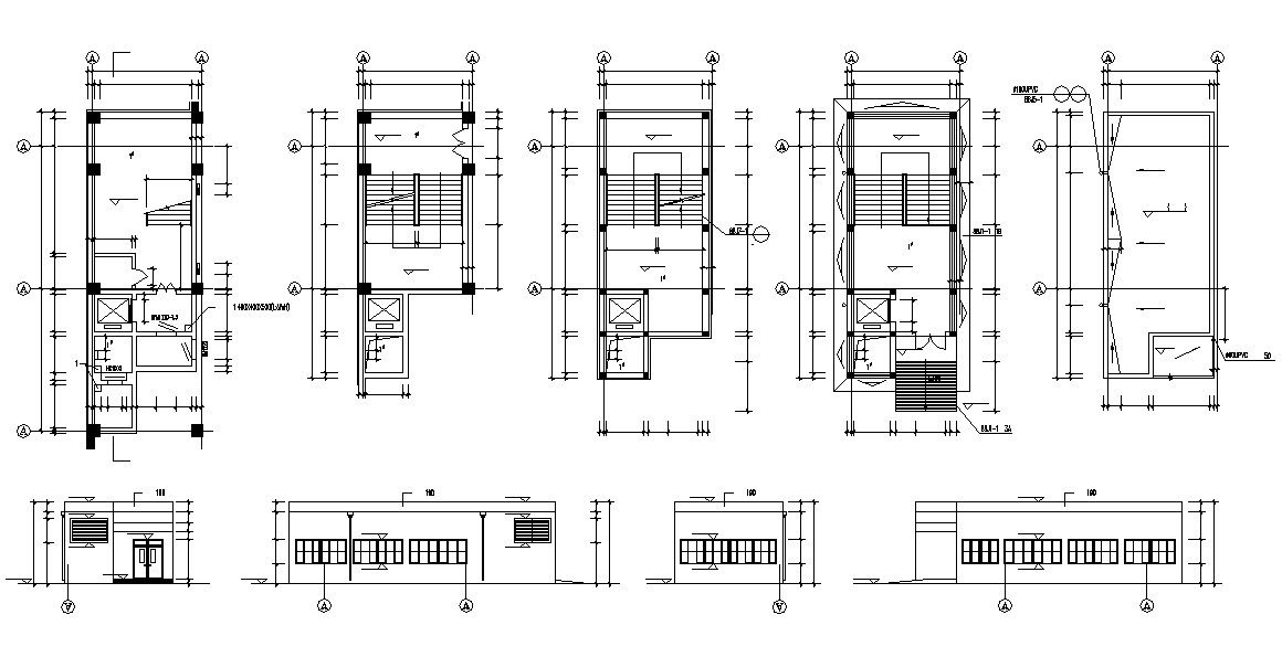 Building design layout plan along with staircase design, dimension set, column plan details along with building different sides of elevation details download AutoCAD drawing for the detailed work design plan.