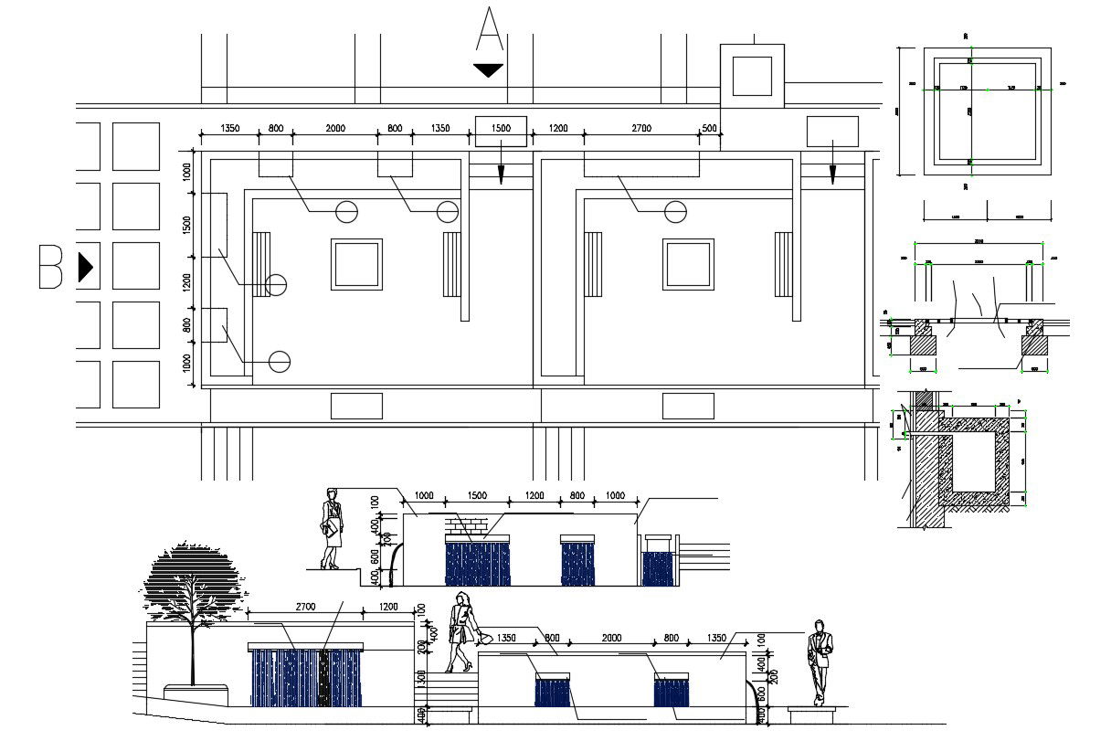 CAD drawing file of a wall fountain with detailed elevations, plan, and dimensions for use in interiors and outdoor landscaping. Suitable for architects, designers, and landscape planners, the DWG file allows precise design implementation, functional layout planning, and professional visualization. It ensures the effective integration of water features into residential, commercial, and recreational spaces.