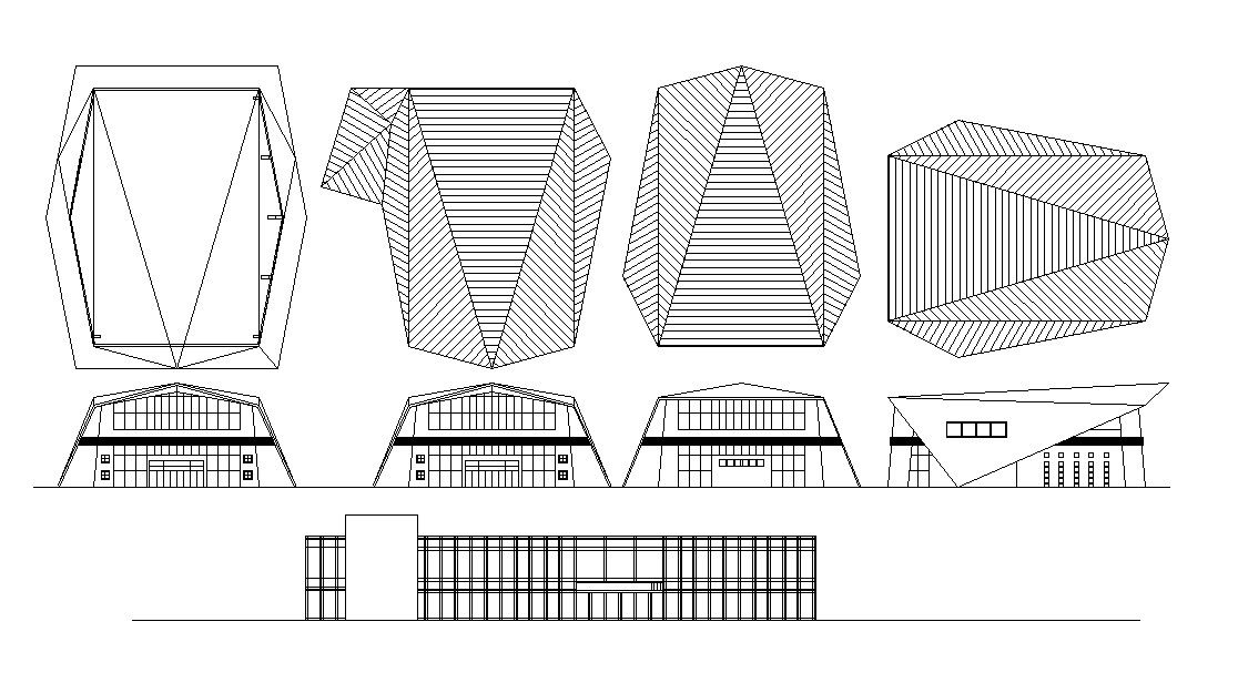 Commerce building front elevation, side elevation, rear elevation, and a top elevation design AutoCAD Drawing download for free.