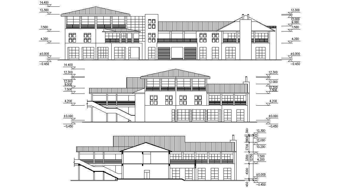 Commercial building hub different sides of elevation design that shows building front elevation, side elevation, and rear elevation design along with building leveling details download CAD file for free.