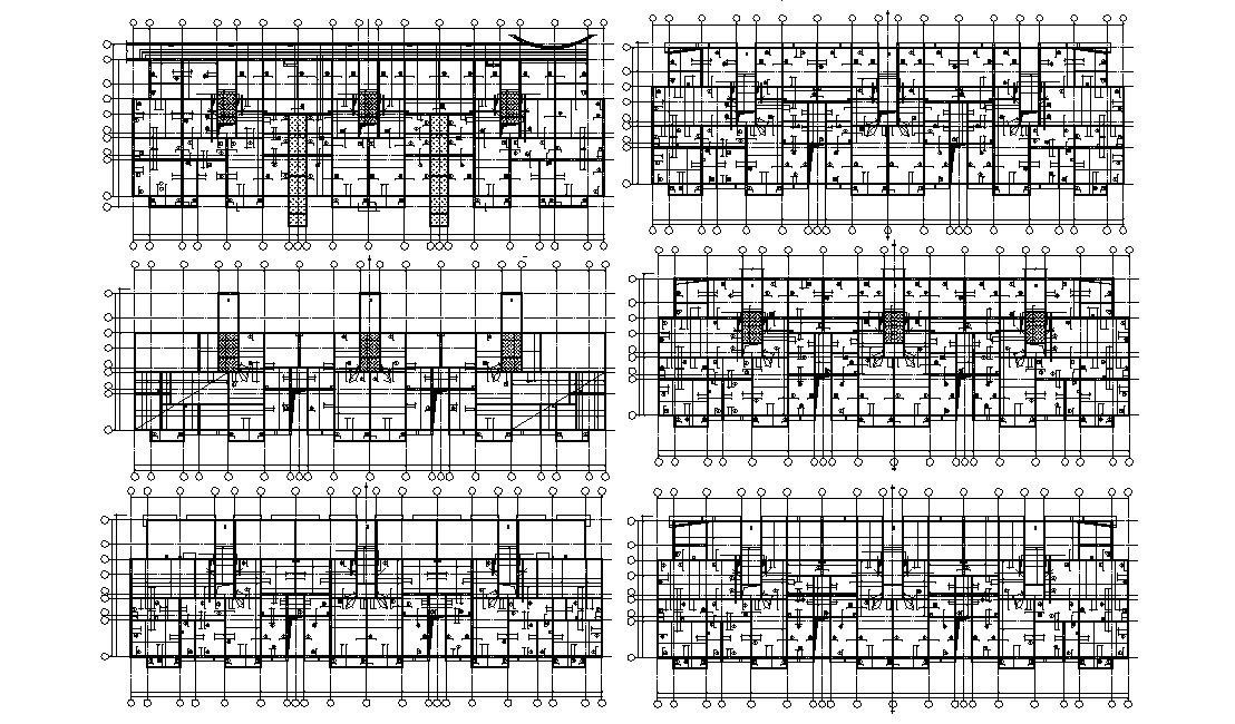 Apartment building drawing; shows the details of all floors and the terrace of the apartment. It also has shown the dimension details along with the centerline plan.