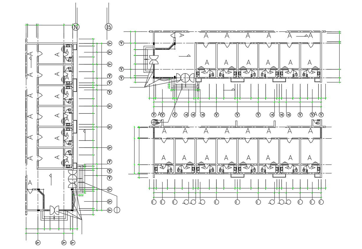 Hostel Building Plan AutoCAD File Free Download; this is the simple hostel plan includes rooms, attached toilets, passages, dimensions, centerline, in DWG format.