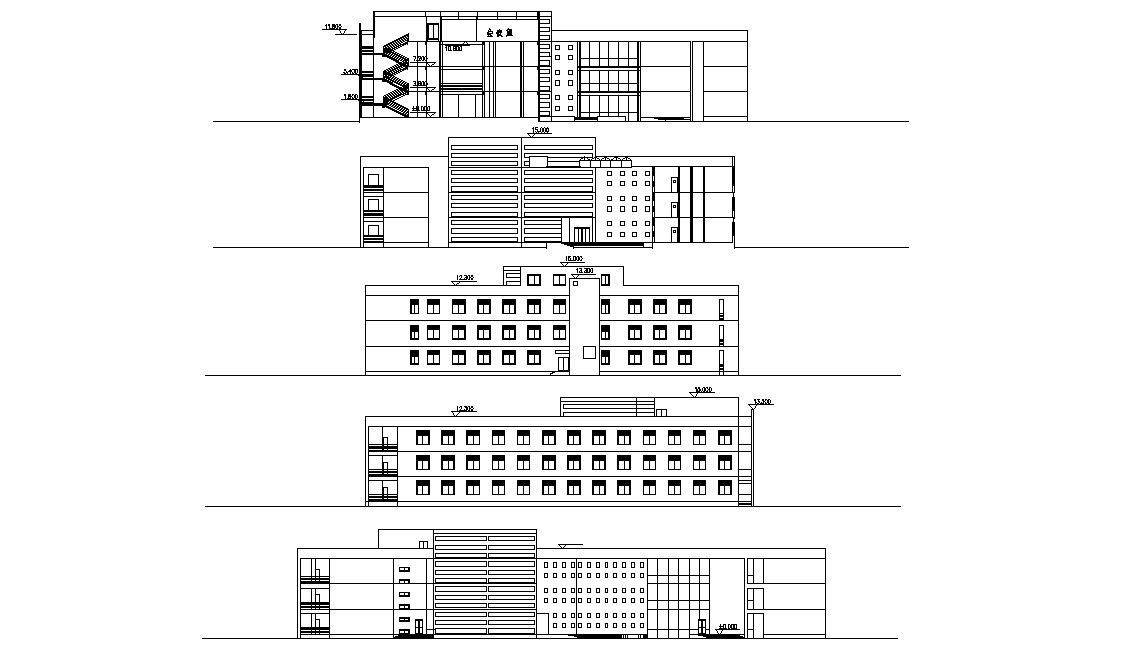 Hotel building design front elevation, side elevation, and rear elevation along with building section drawing details download AutoCAD Drawing for free.