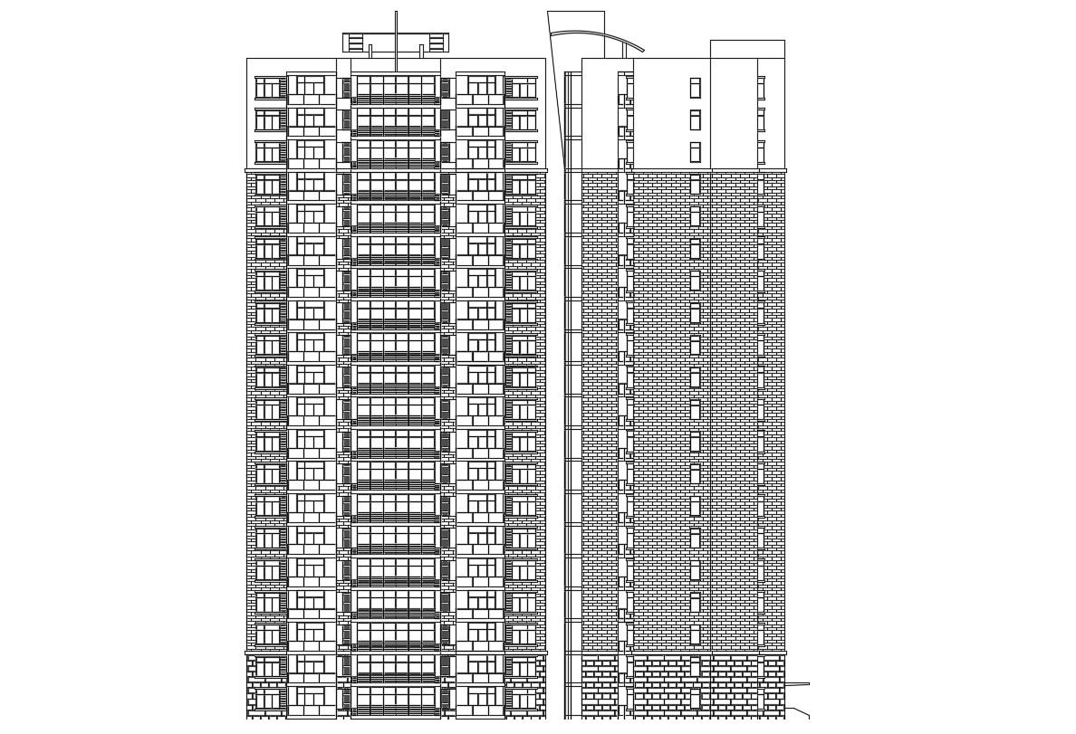 Multi-Storey Apartment Building Elevation Design; download free AutoCAD file of Multi-Storey Apartment building front elevation and rear elevation design in AutoCAD format.