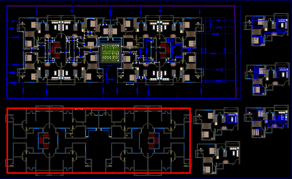 A Modern Apartment floor plan DWG AutoCAD Drawing file is given. In this Apartment floor Plan, a total of eight flats are available. Each flat has two bedrooms. They are a Master bedroom and a children's bedroom. Moreover, the Wash area, Drawing room, Kitchen, Dining, TV Lounge, and lobby are available in all the flats. The staircase and the lift are available inside the apartment building.