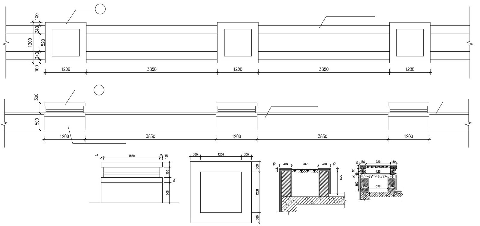 2d CAD drawing details of compound wall front elevation design along with boundary wall plan, wall-length height, and various other blocks details download file for free.
