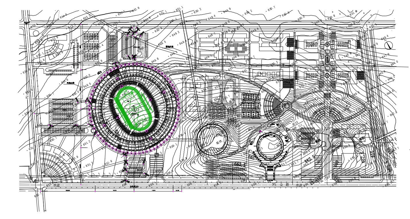 CAD drawing details of area contour planning design that shows contour lines details along with area landscaping design, sports ground, road networks, existing building, and various other details download the file.